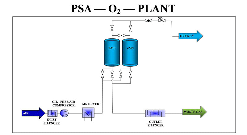 The pressure swing adsorption process for a PSA oxygen generator is essentially the same as that of a nitrogen generator with one major distinction. The adsorptive material inside its molecular sieve is made of zeolite rather than carbon found in a nitrogen PSA device.